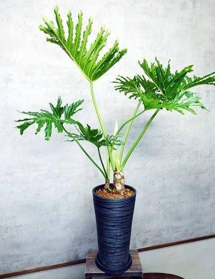 手のひらを広げたようなギザギザの大きな葉がダイナミックに広がっています。葉が抜け落ちた後にできる目玉模様の凸凹幹や茎から出る太い気根も魅力的です。ダイナミックで力強さが感じられ、この木を触るとパワーが貰えそうですね。性質は強健で、耐寒性、耐陰性ともに強く育てやすい観葉植物で初心者の方にも大変オススメです。熱帯の植物らしくエキゾチックな姿が人気の観葉植物です。フィロデンドロン・セロームの花言葉は、「用心深い人」「愛の木」です。