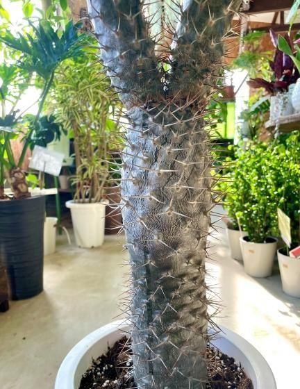 ◆特 徴個性的な姿のパキポディウム・ラメリー。特大サイズの枝分かれブランチタイプです。ラメリーは塊根植物と言われている植物の一つで、刺々しいメタリックグレーの幹がかっこいい品種です。パキポディウムの中ではびっしりと生えた棘が特徴です。個性的でインパクトある鬼の金棒のような太い幹は、 生長とともに伸びていきます。パキポディウムの中でも育てやすいい品種です。